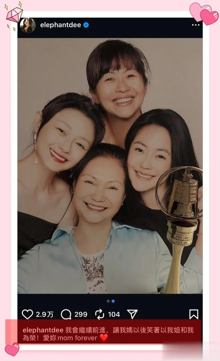 小S还把奖杯跟全家福合了影,表示会努力让黄春梅以她为荣!